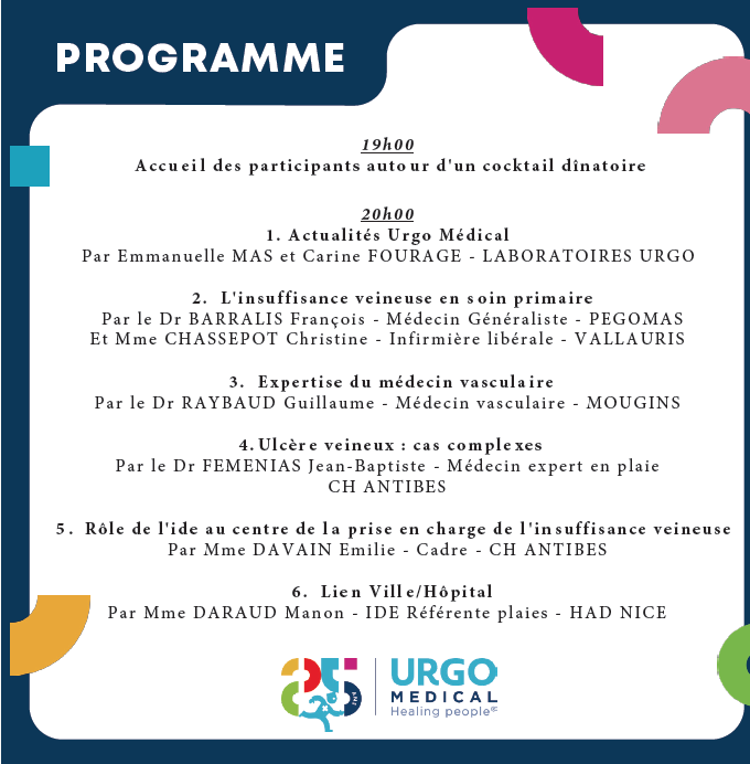 organisent une soirée conférence sur le thème "Approche pluridisciplinaire dans la prise en charge des plaies du sujet agé" le jeudi 13 Novembre 2025 à partir de 19 heures 30 au CHATEAU des OLLIERS à NICE .